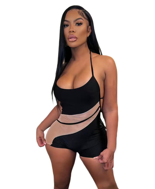 Contrast Mesh Halter Pajama Romper, Scoop Neck Backless Lace Up Pajamas, Women's Lingerie & Sleepwear