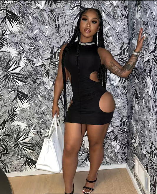 Cut Out Solid Dress, Sexy Sleeveless Bodycon Crew Neck Bag Hip Mini Dress, Women's Clothing