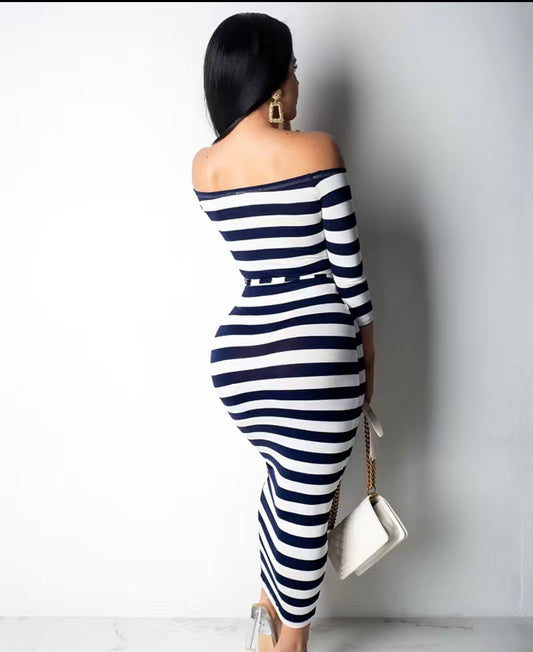 Off Shoulder Striped Dress, Stretchy Long Sleeve Dress, Casual Every Day Dress, Women's Clothing
